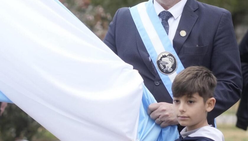 Junto a autoridades municipales, provinciales, educativas, representantes de fuerzas vivas, abanderados, ex combatientes y vecinos de la ciudad, entonaron las estrofas del Himno Nacional Argentino a cargo de la Banda Municipal, mientras se realizó el izamiento de nuestro símbolo nacional.