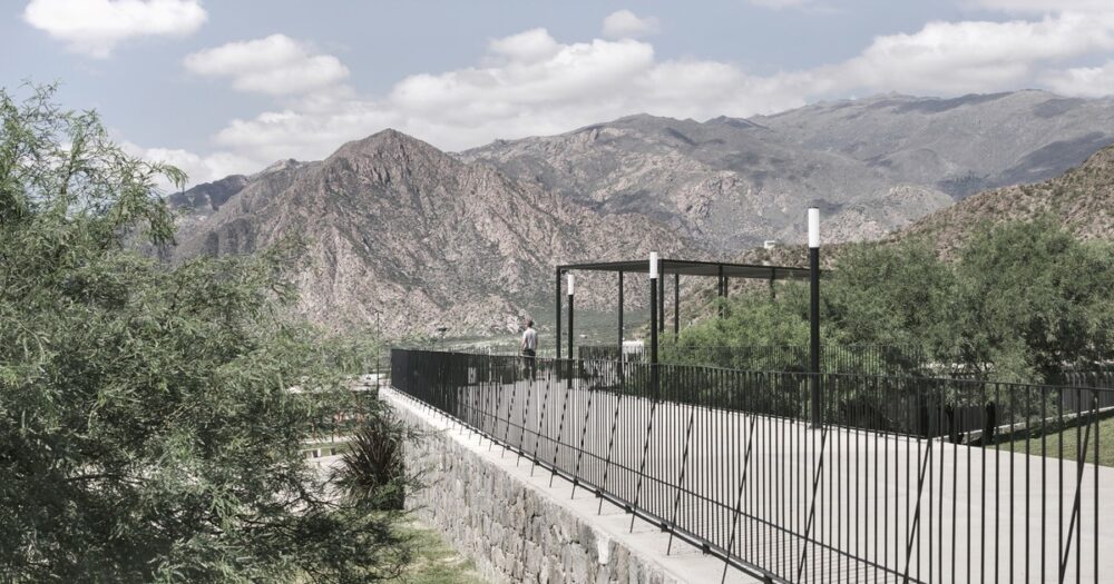 La plaza aprovecha la particular geometría de un terraplén para crear terrazas y miradores, en una zona en expansión urbana.