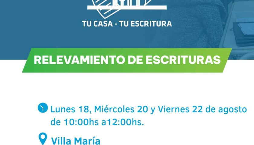 La Municipalidad de Villa María informa que, en el marco del programa “Tu Casa – Tu Escritura”, se llevará a cabo un relevamiento de escrituras en el Centro Vecinal del barrio San Nicolás (Catamarca y Sarno).