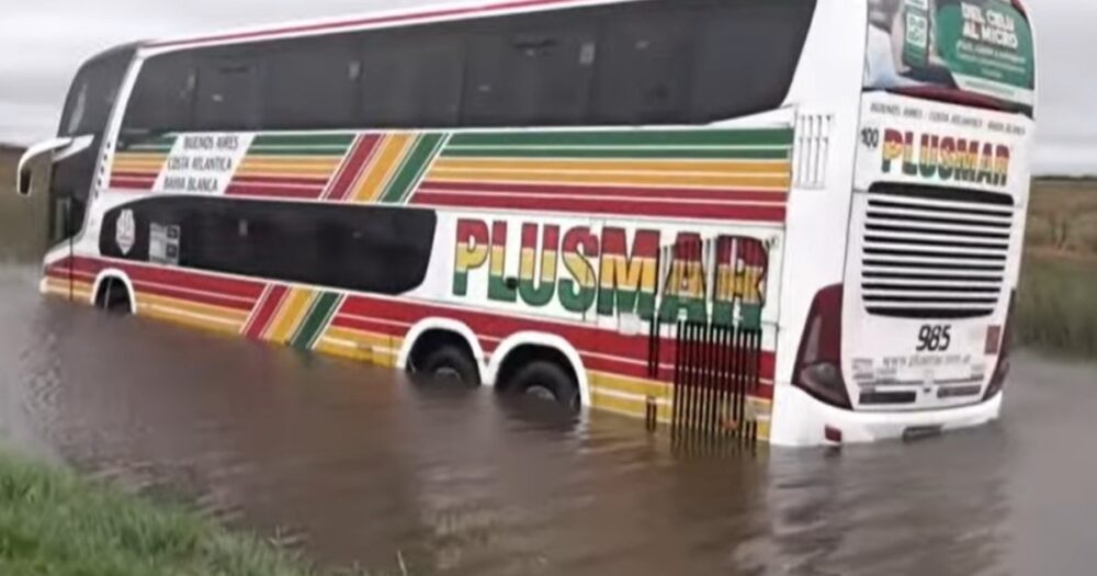 Un micro se fue a la banquina por la tormenta de Santa Rosa y quedó varado en una zanja inundada: “Una ráfaga nos sacó de la ruta 5”