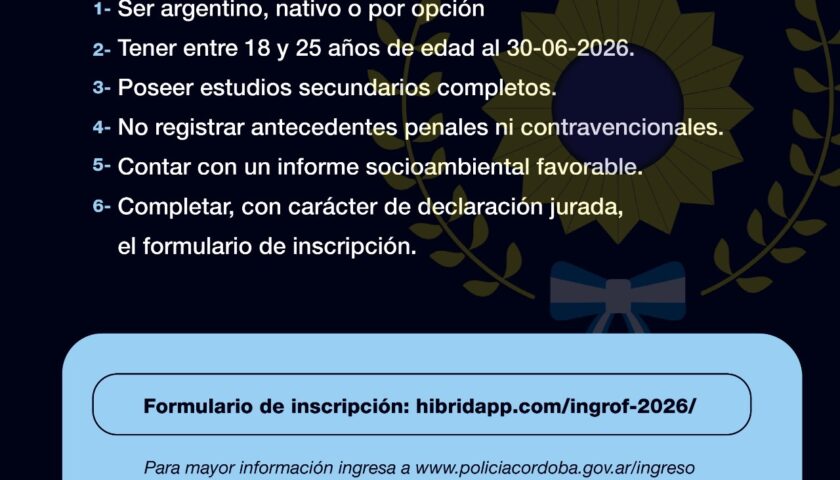 Los requisitos de ingreso se pueden conocer a través del siguiente link: https://www.policiacordoba.gov.ar/ingreso/page2.html