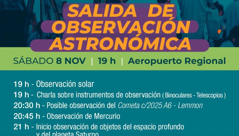 La Municipalidad de Villa María informa, a través de la Secretaría de Educación, que el sábado 8 de noviembre, desde las 19 horas, se llevará adelante una jornada de observación astronómica abierta a toda la comunidad en el Aeropuerto Regional.